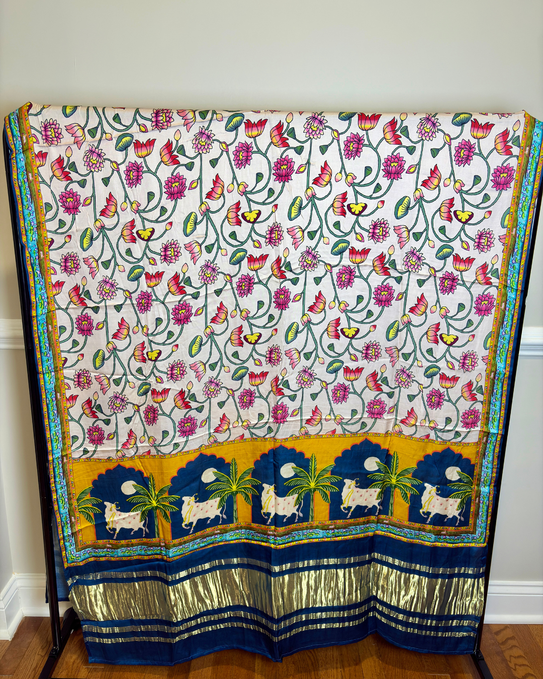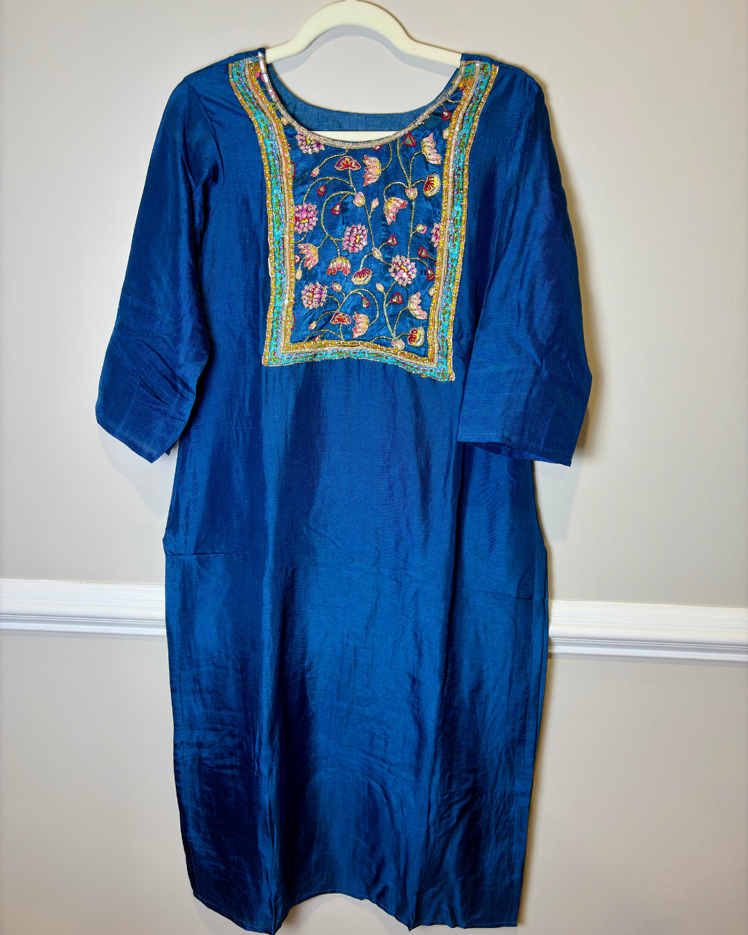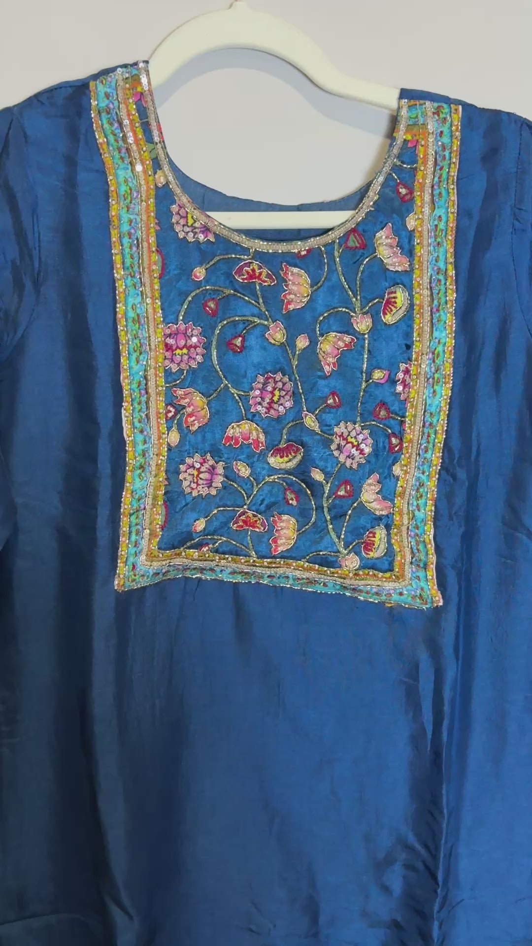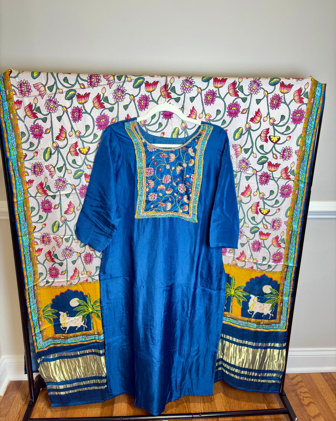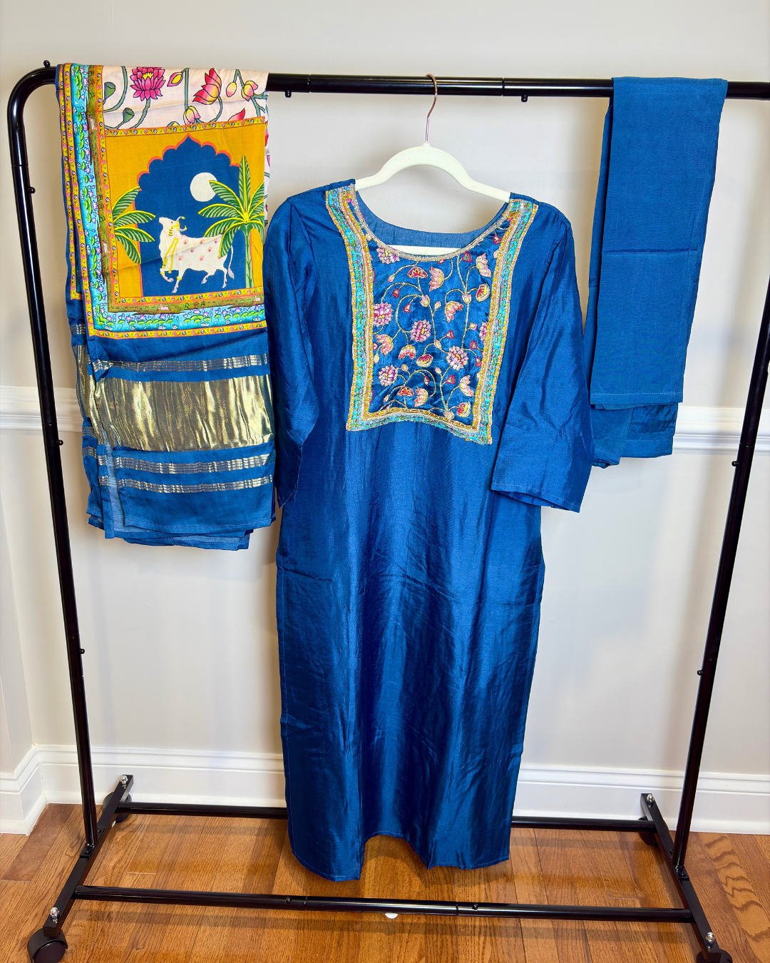 Blue Hand Work 3-piece Russian Silk Suit Set with Pure Gajji Kalamkari Dupatta with Lagdi Patta