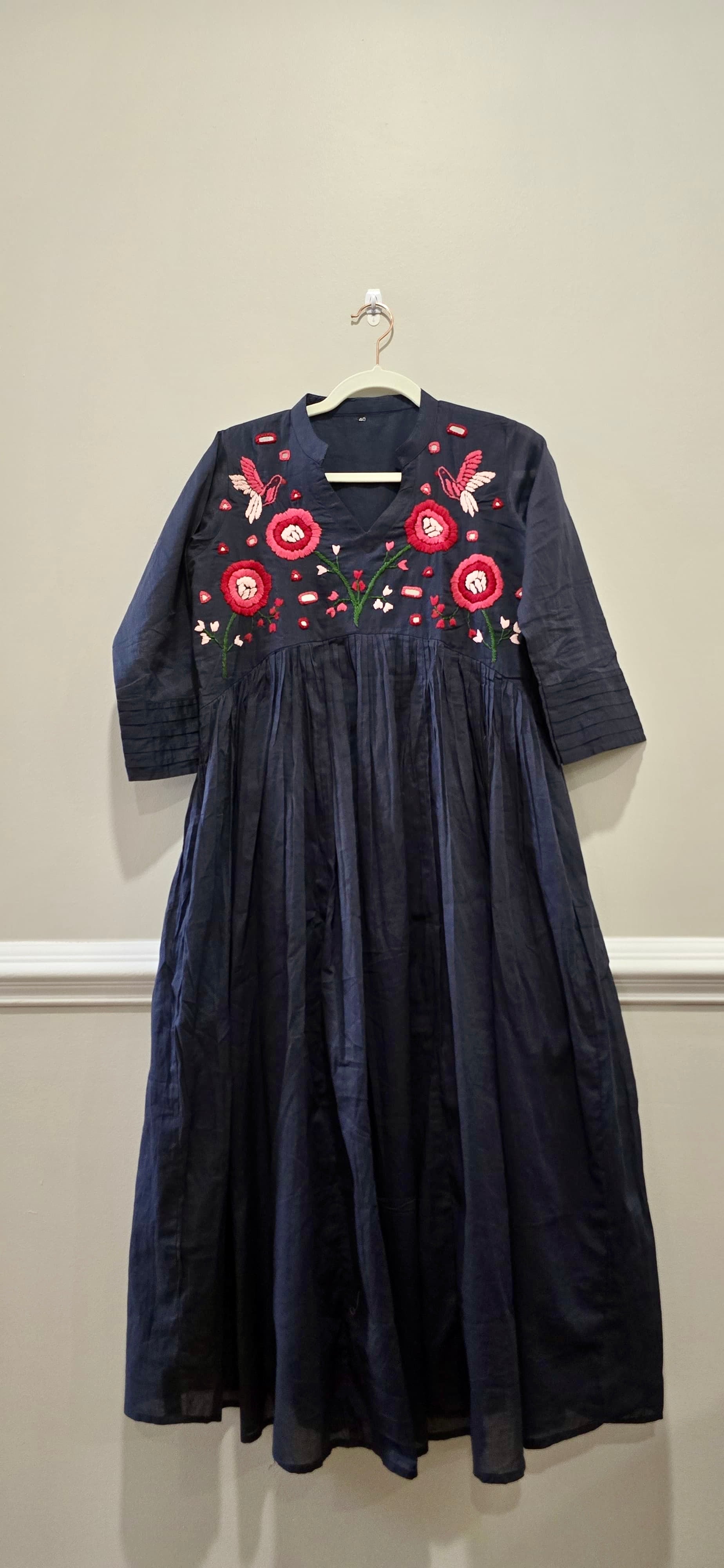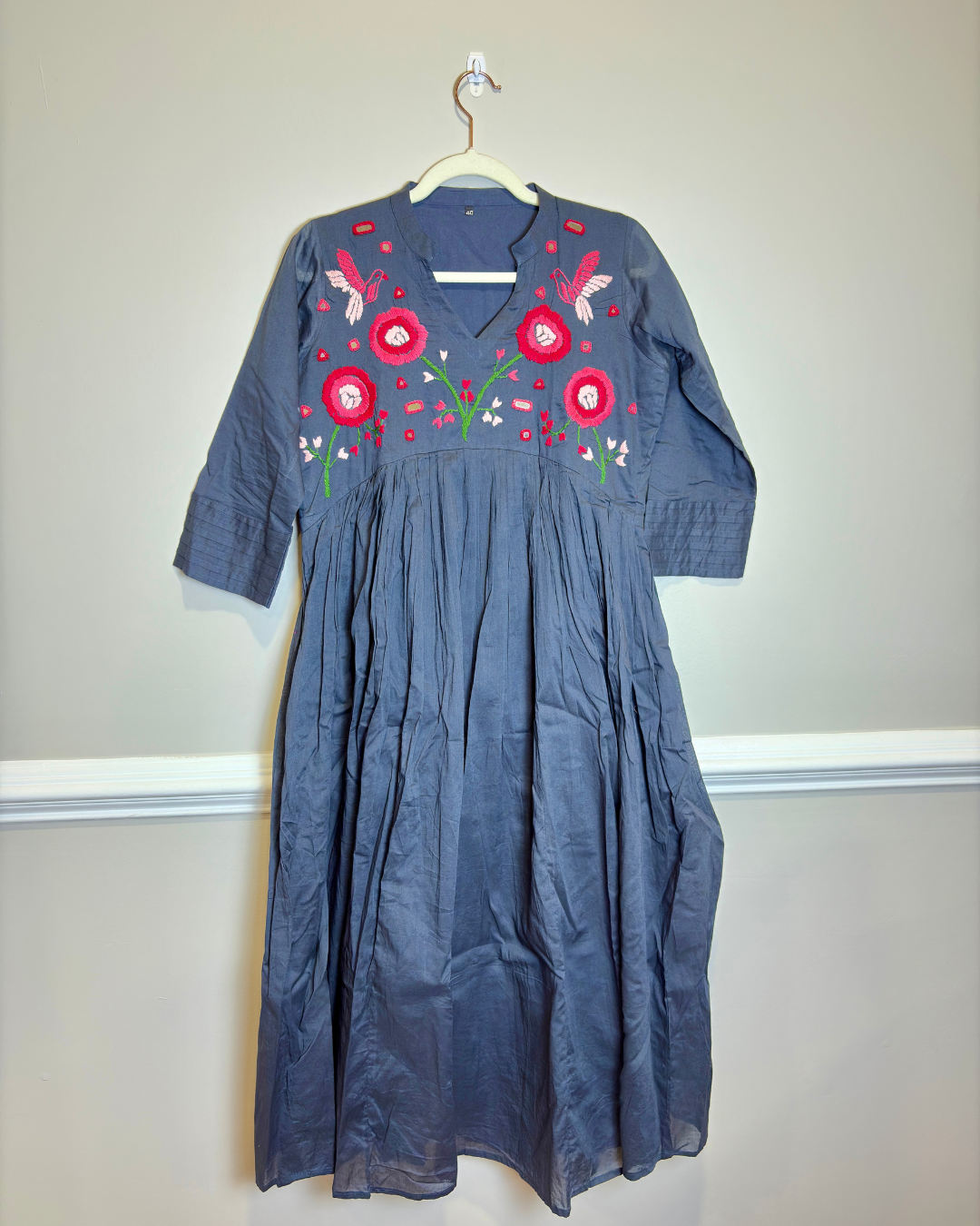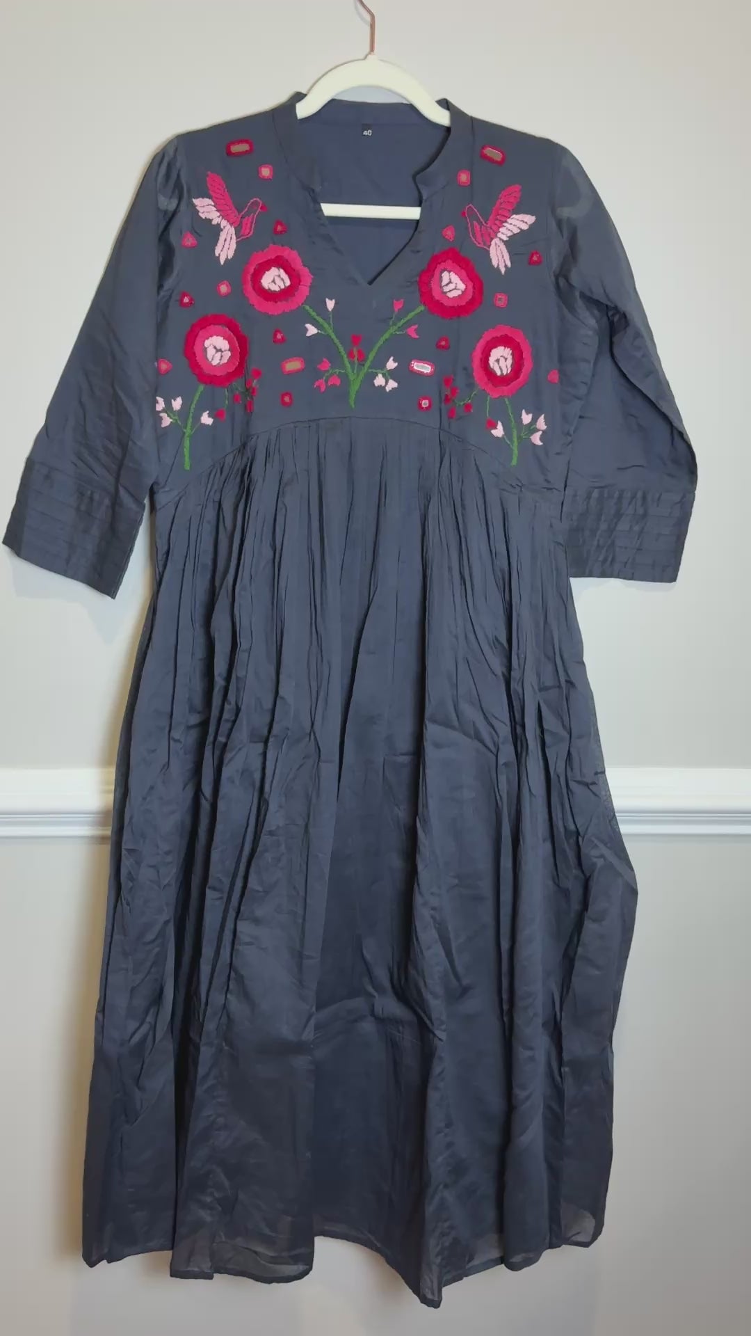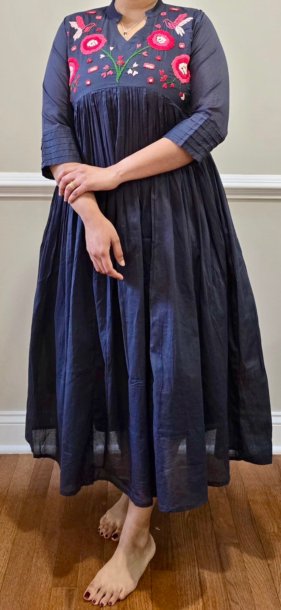 Black Grey Flared Dress/Kurta with Hand-Embroidered Floral Yoke