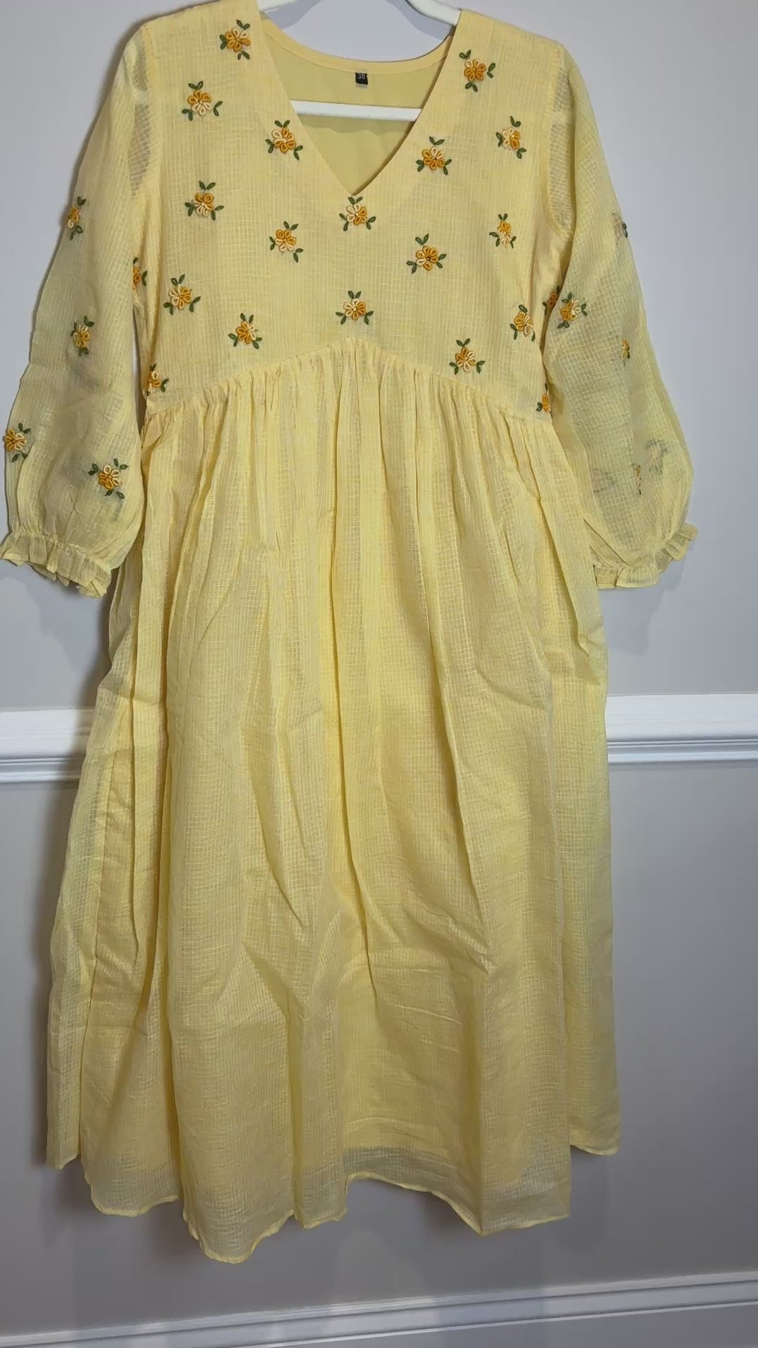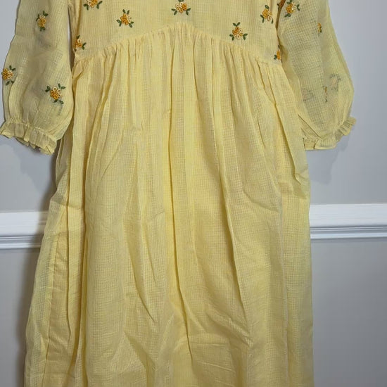 Pastel Yellow Alia Cut Dress/Kurta with Hand-Embroidered Bullion Floral Yoke
