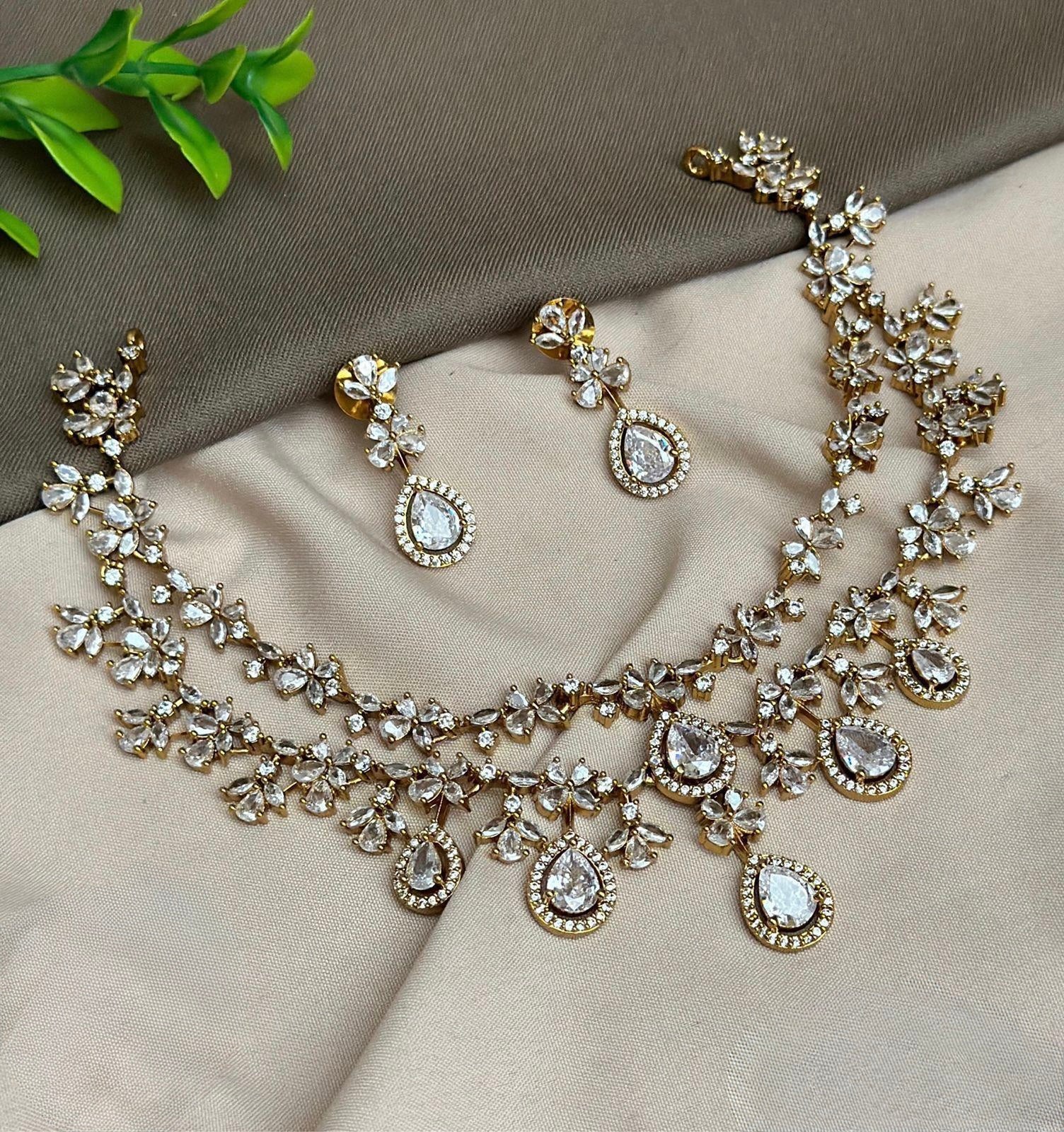 Sparkling bridal AD necklace set featuring an intricate design with dainty teardrop earrings. Perfect for weddings, receptions, or festive occasions. Elegant Indian jewelry that makes a beautiful bridesmaid or bridal gift.