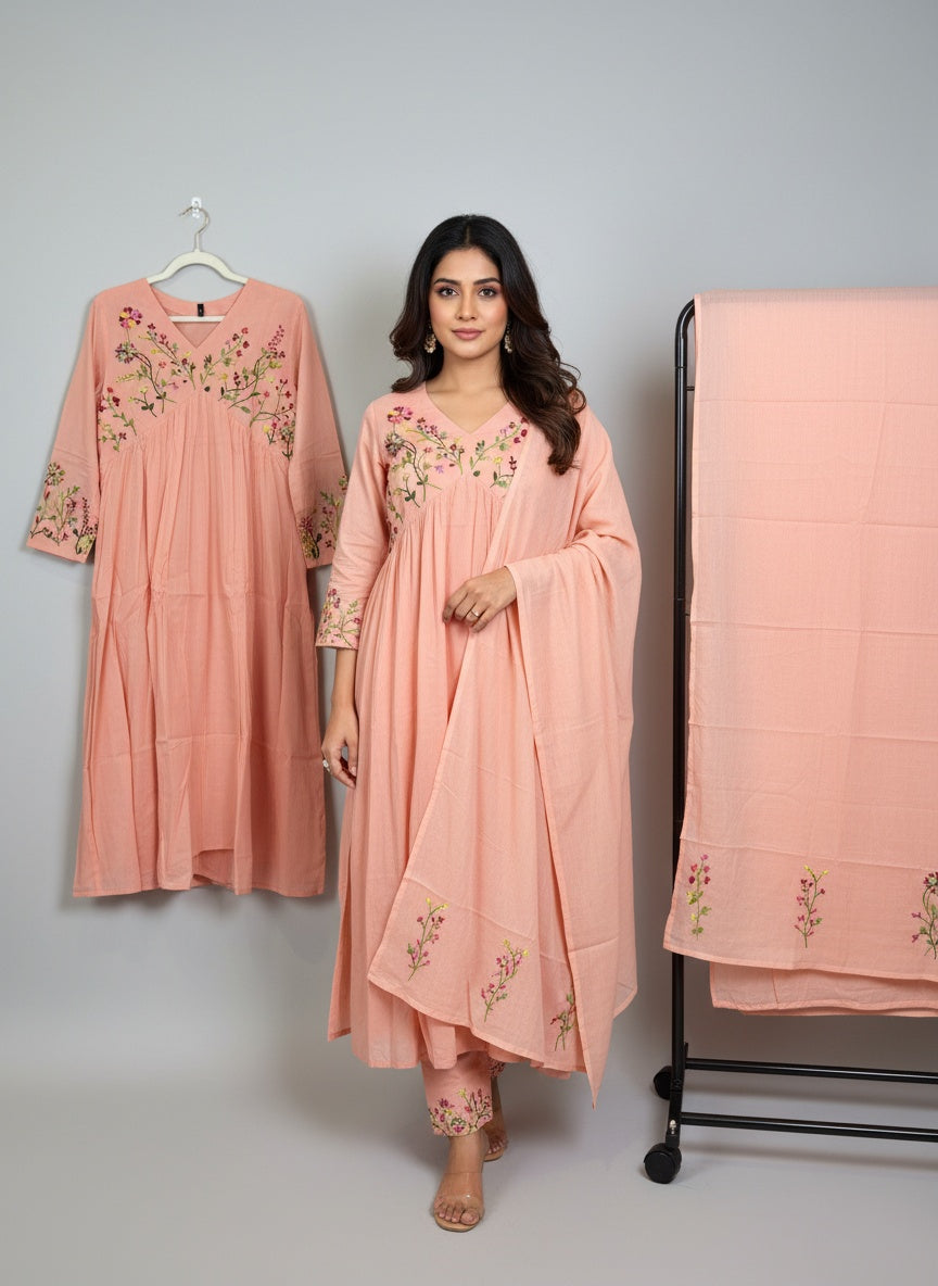 3-piece Alia Cut Suit Set with Hand-Embroidered Floral Yoke,Sleeves, Pant and Dupatta