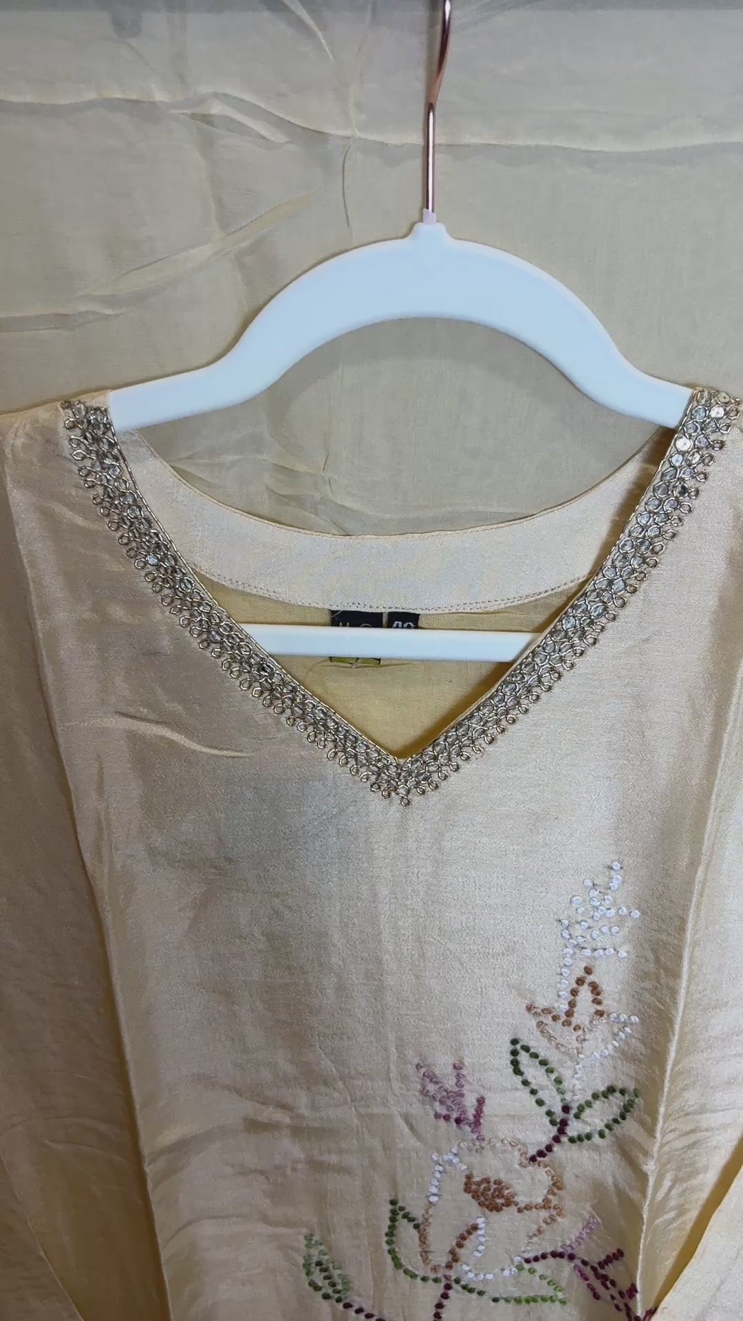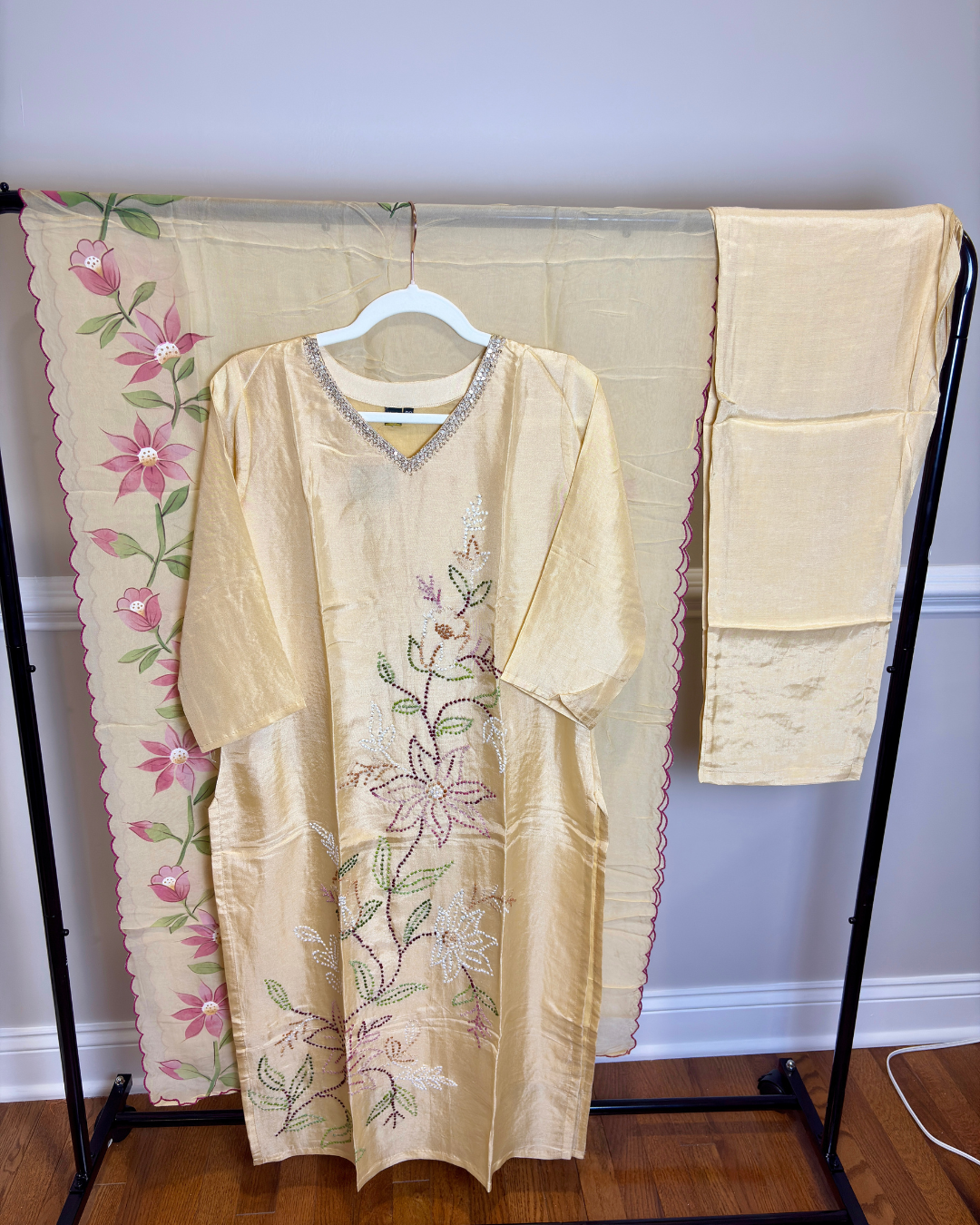 Beige Hand Work 3-piece Dola Silk Suit Set with Hand painted Scallop work Dupatta