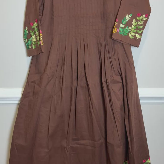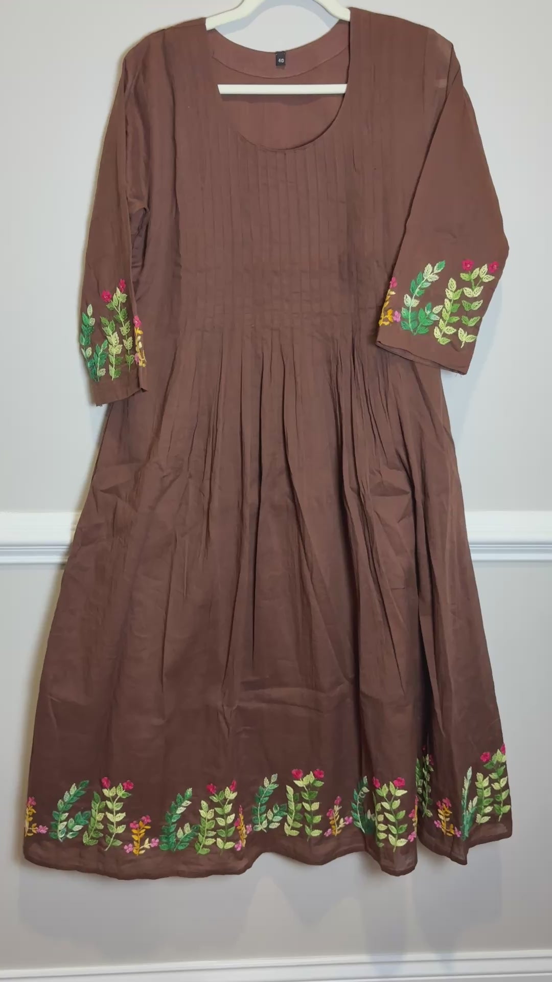 ๐ค Brown Flared Dress / Kurta with Floral Hand Embroidery on Sleeves and Hem