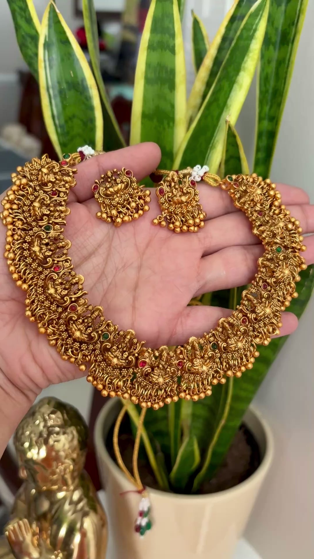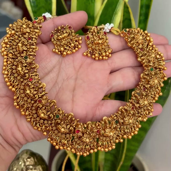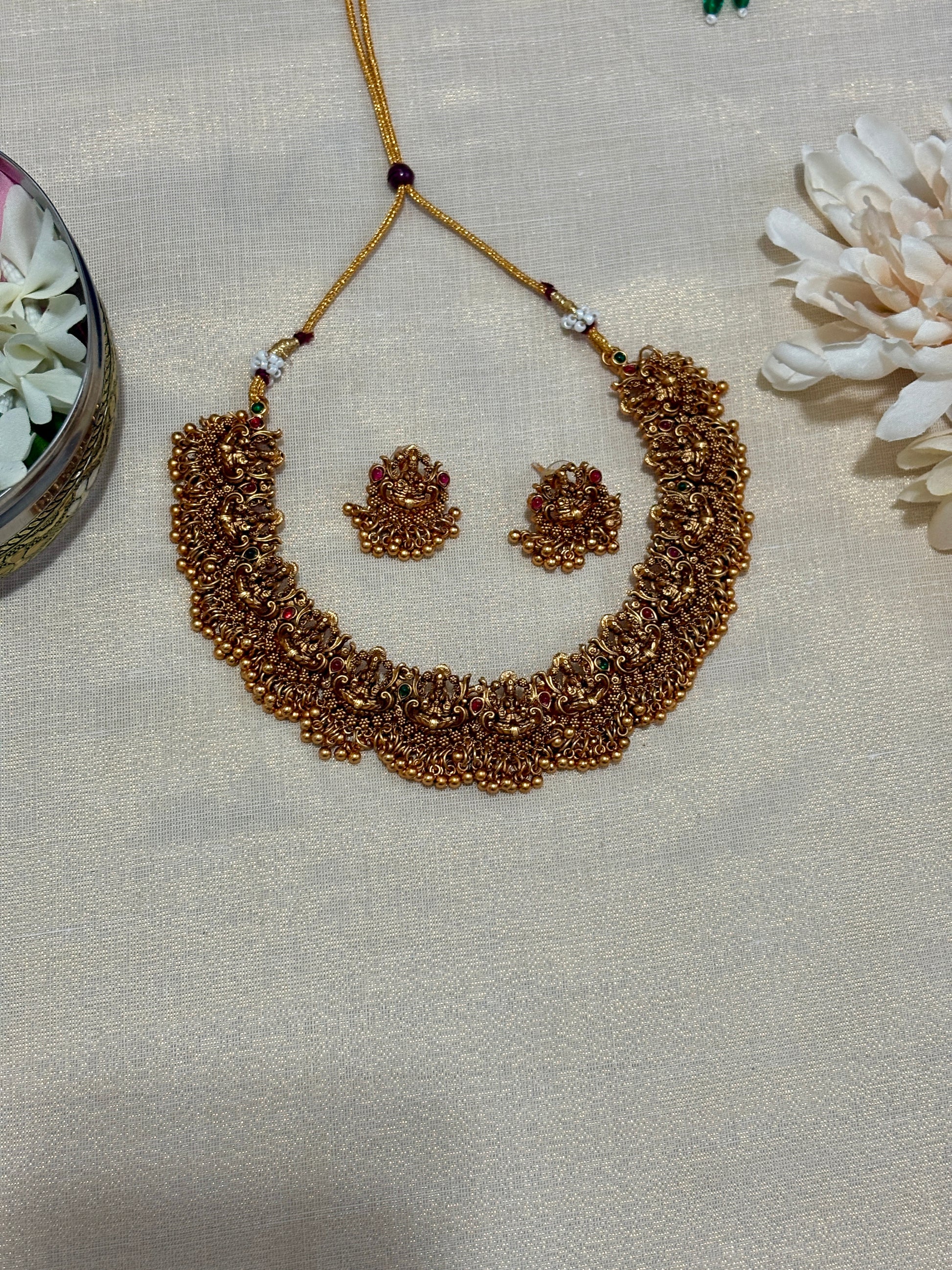 Beautiful Lakshmi cluster necklace, a stunning piece of Indian jewelry perfect for weddings, festivals, or parties. Traditional design with divine Lakshmi motifs and elegant ethnic detailing.