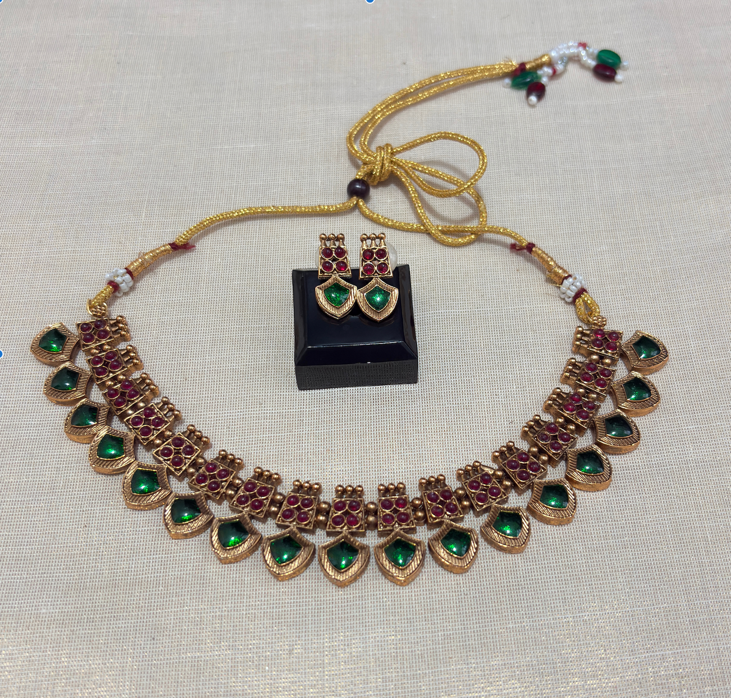 Palakka Necklace with Studs – A timeless piece of Kerala’s traditional jewelry, crafted with vibrant green Palakka leaves and golden detailing. Paired with matching studs, this elegant set is perfect for weddings, festivals, or adding a touch of heritage to any outfit. Lightweight, classic, and designed to celebrate tradition with style.