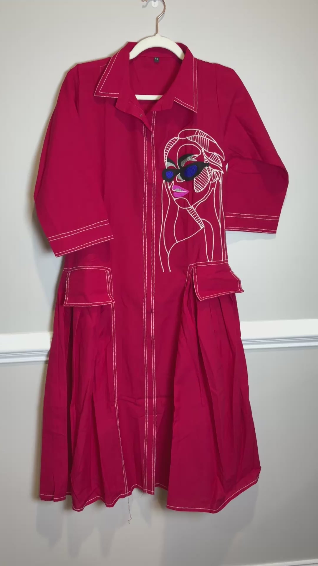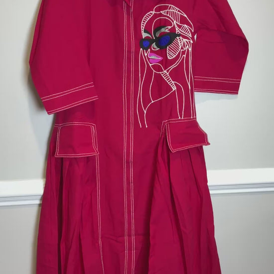 ๐ด Red Flared Dress / Kurta with Embroidered Face Art on Front Panel and Pockets