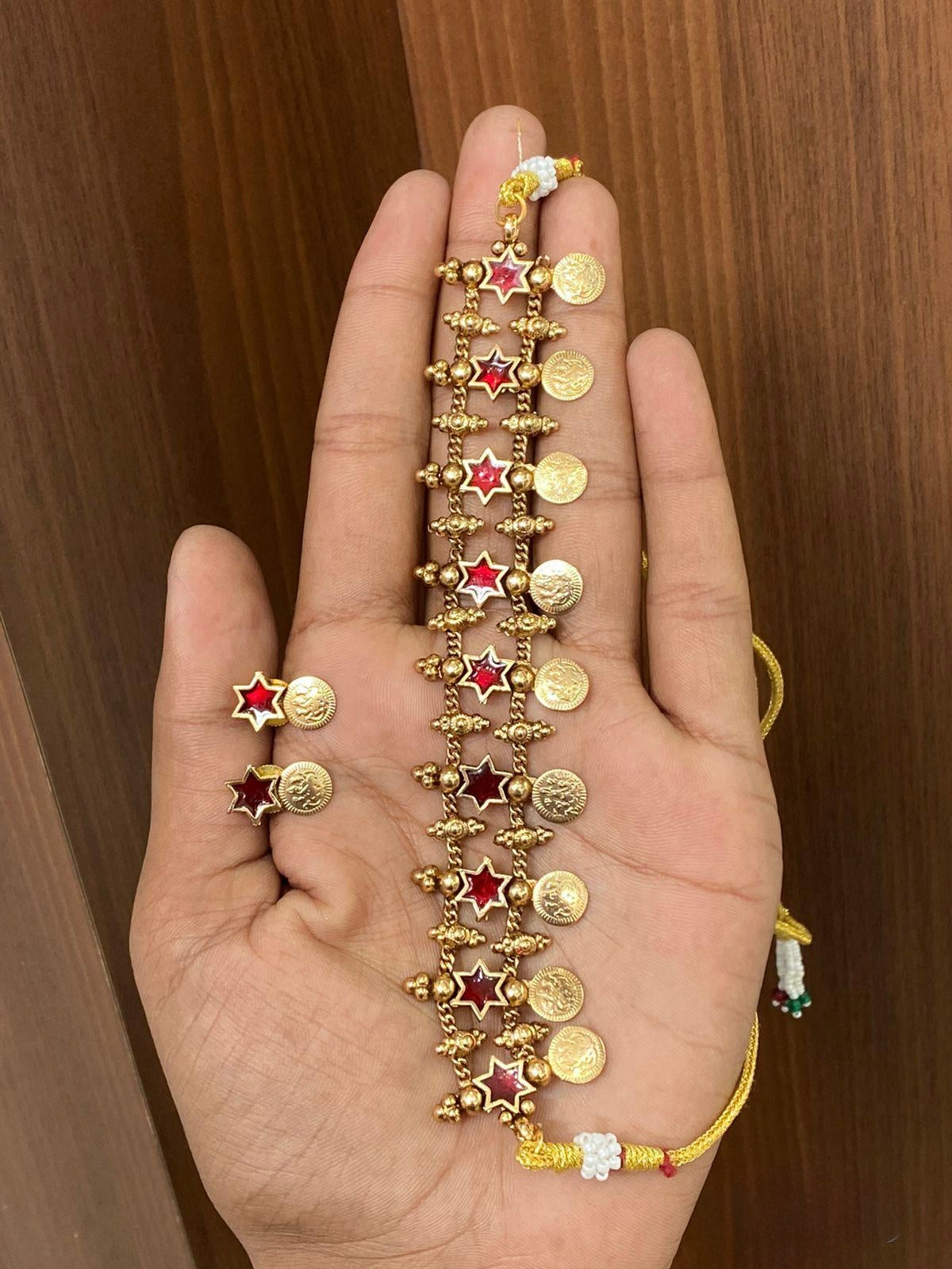 Elegant Kaashu coin and star enamel choker necklace with matching earrings. A handcrafted statement piece, perfect for weddings, festive occasions, or traditional celebrations.